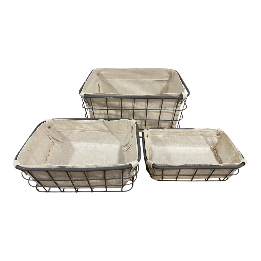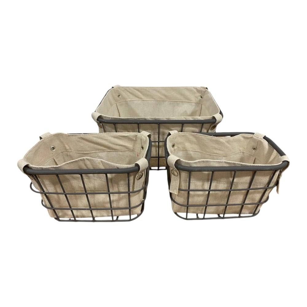 CANASTO METAL CON TELA SET X 3 MT-575 - S: 8x18x28cm / M: 12x22x32cm / L: 18x28x38cm